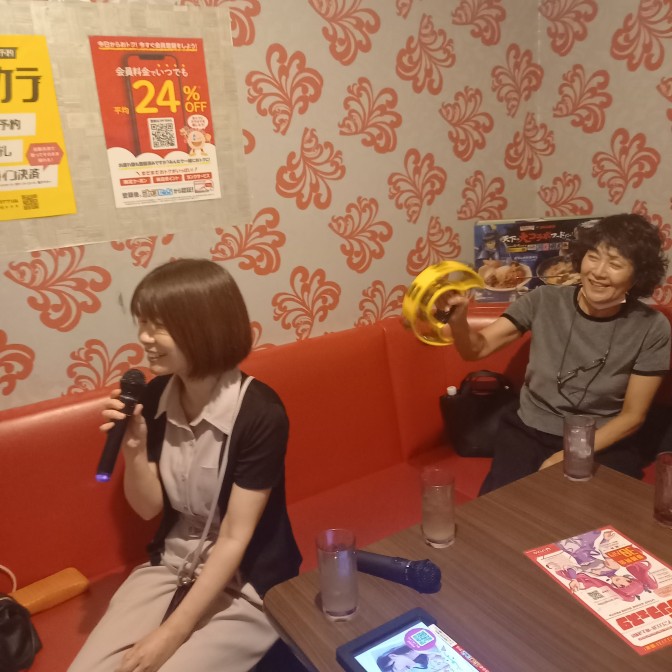 そして、荒巻施設長は、「一人でも多くの職員さんと楽しい時間を共有したい」との思いから多忙な業務の中、可能な限りのコースに参加してくださいました。二次会のカラオケでは、なんと歌声も披露してくれました♫