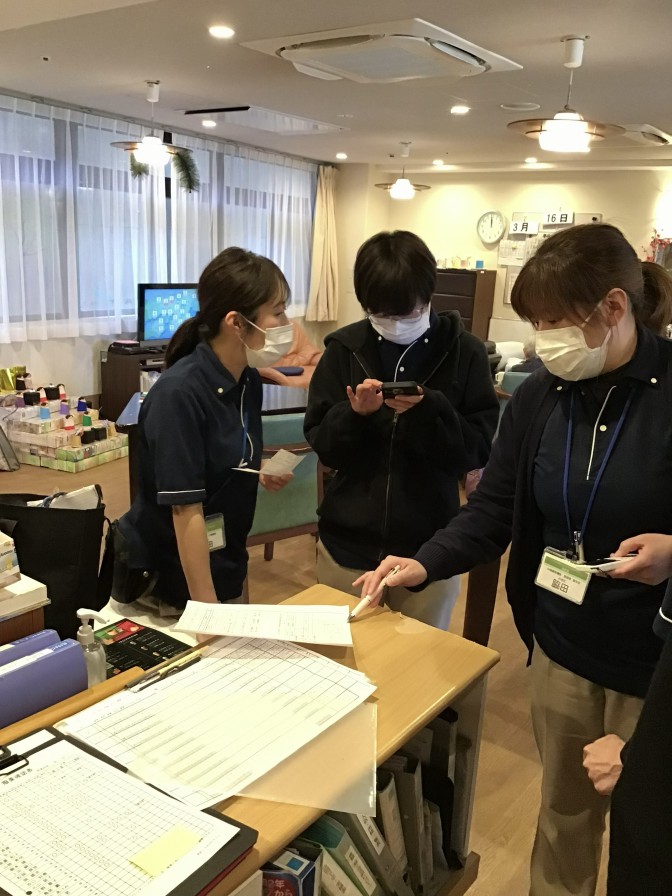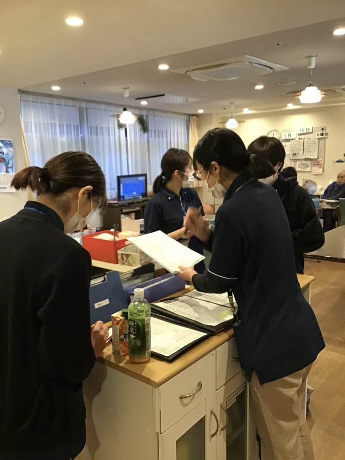 出発前、フロアの一角では職員さんたちが真剣な表情で打ち合わせをしていました。