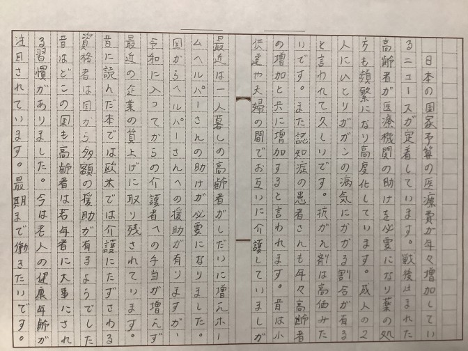 皆さま長らくお待たせ致しました。 ひよどりホームの3階ユニット入居者様"T先生"の作品 第8回です‼ 今回の作品は、 医療や福祉といった社会保障にかかる予算の増加、介護の現状について 書かれています。健康寿命についても触れられており、いつまでも健康で過ごしたいですね。 皆さまもぜひ読んでみてください‼