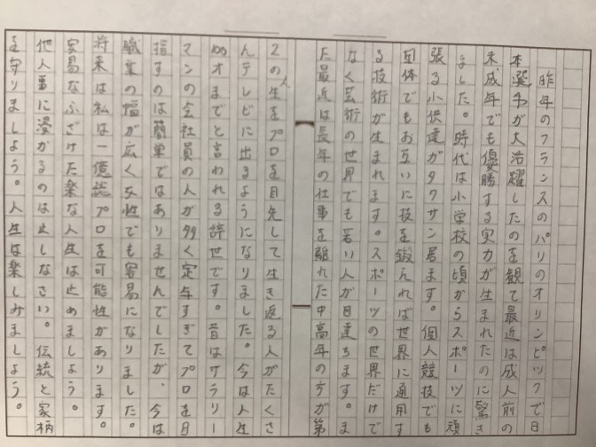 ひよどりホームの3階ユニット入居者様"T先生"の作品 第10回です‼ 今回の作品は、 オリンピックで未成年選手も活躍している話題から入り、定年後にも活躍している人たちの事も語っておられます。プロを目指すのに年齢は関係ない!と力強く語られているようです。 そして最後の一文「人生は楽しみましょう」良い言葉ですね!! 皆さまもぜひ読んでみてください!! 次回のT先生の作品もお楽しみに~(^^)/~~~