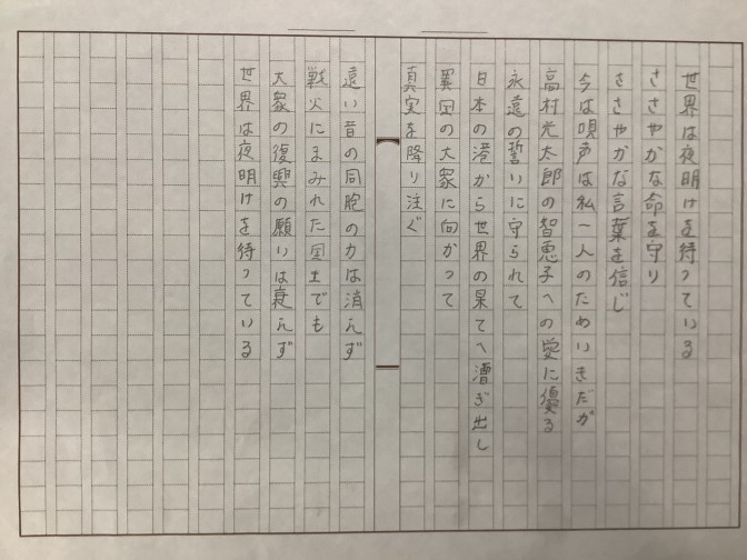 ひよどりホームの3階ユニット入居者様"T先生"の作品 第15回です‼ 今回の作品は、 何かの詩の一文でしょうか? 「高村幸太郎」「智恵子」から智恵子抄に掲載されている詩だとは思うのですが... 無知な私には分かりません(;´・ω・) こう言った話題で盛り上がれるほど博識になりたい今日この頃です。 皆さまもぜひ読んでみてください!! 次回のT先生の作品もお楽しみに~(^^)/~~~
