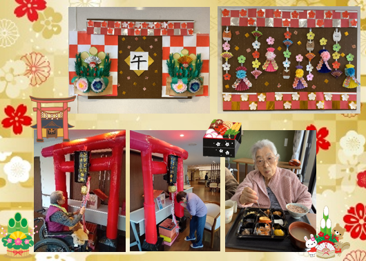 ひよどりホームでも職員が門松や鳥居(神社)、その他お正月飾りを手作りして飾りました。