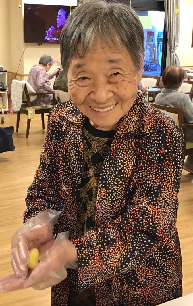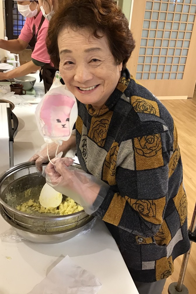 秋の味覚!スイートポテトのおやつレクリエーション! 皆さんにスイートポテトを作っていただきました! サツマイモを滑らかにつぶす工程からして頂きました! 形を整えてオーブンへ★ 完成後青空の下で頂きました(^▽^)/ 外で食べるおやつは一段とおいしいですね(^▽^)/ 朝晩が冷え込む季節になってきましたが、元気に営業してまいります!