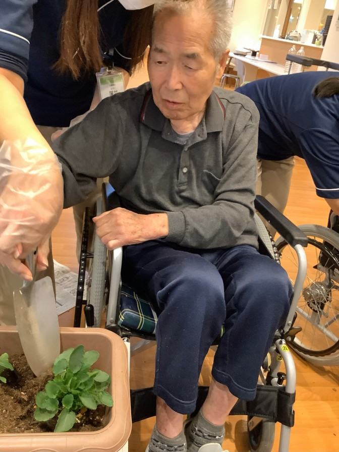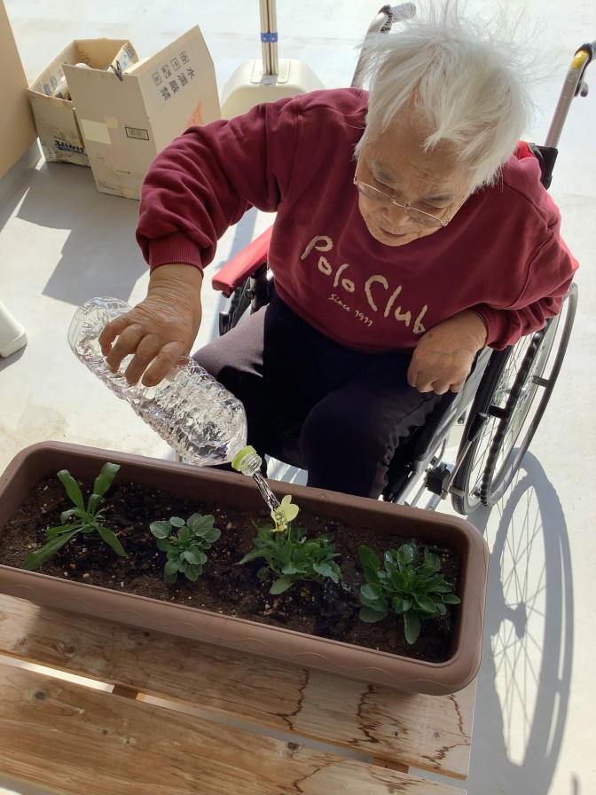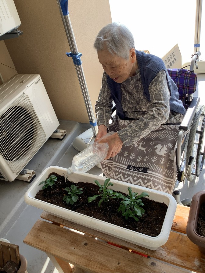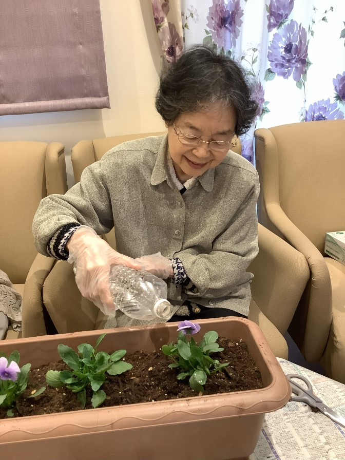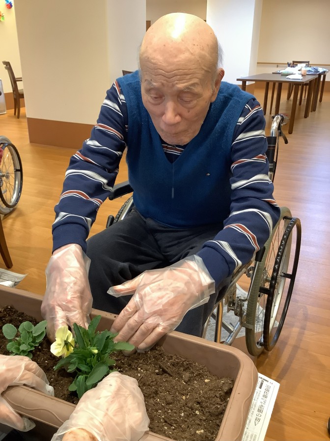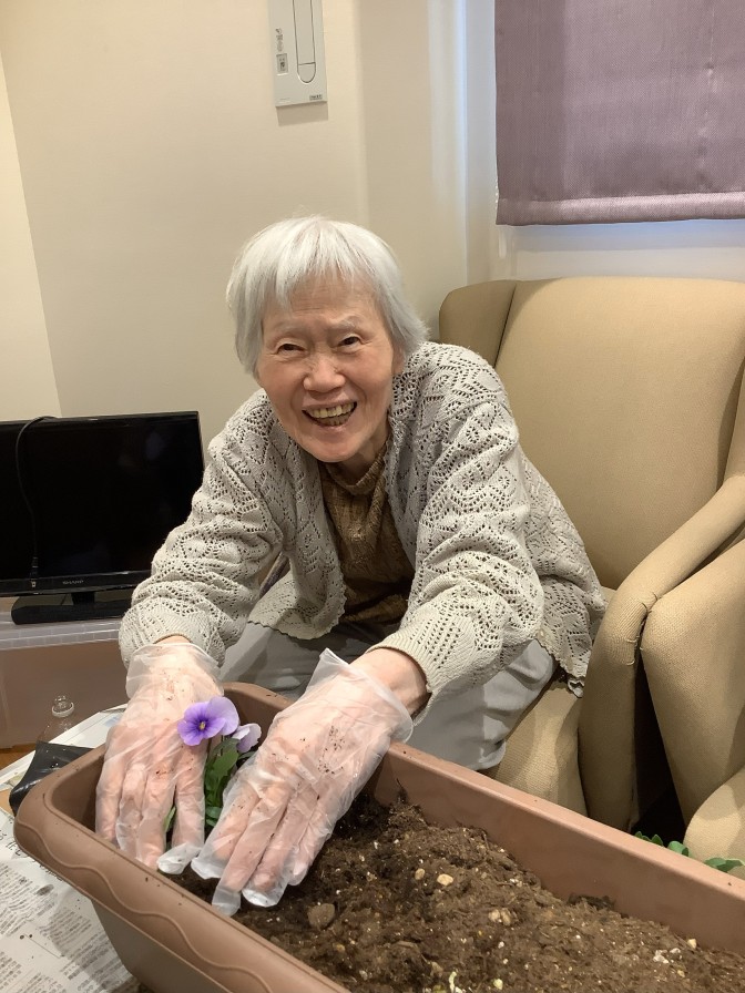 11月の楓菫ユニットでは、花いっぱい運動を行いました! 入居者様に、鉢にお花を植えて頂きました。「若い頃は百姓やってな」と皆さん手際が良かったです!皆さんに最後まで、綺麗に植えて頂きました! これから毎日水やりをし、綺麗に咲かせましょうね^^ 鉢植えをされてから、しばらく晴天が続きましたので、毎日ベランダに出て頂き水やりもして頂きています^^