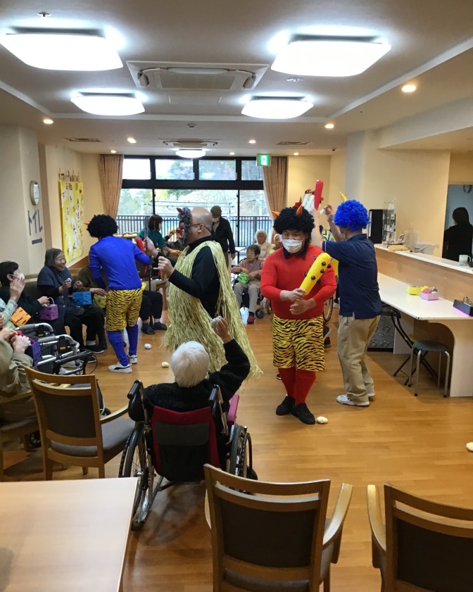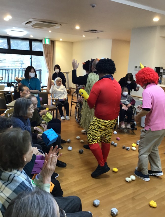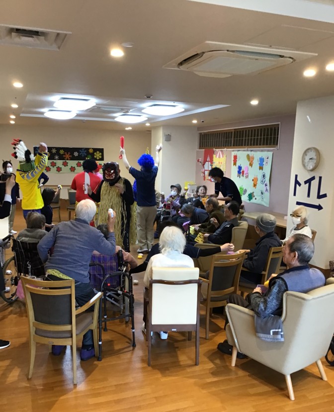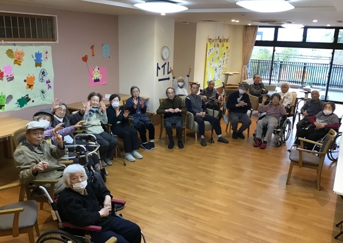「鬼は外、福は内」の声掛けで豆まきをしてひと汗かいた様子(-_-;)