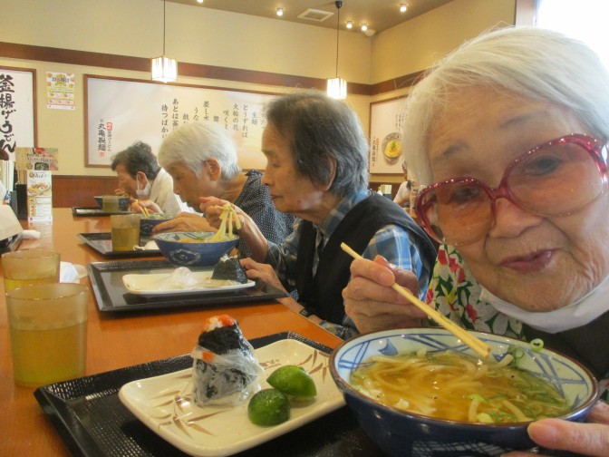 食欲の秋ということでさつき園デイサービスでは近所に丸亀製麵が営業しており、ご利用者様と一緒にうどんを食べに外出企画をしました!!