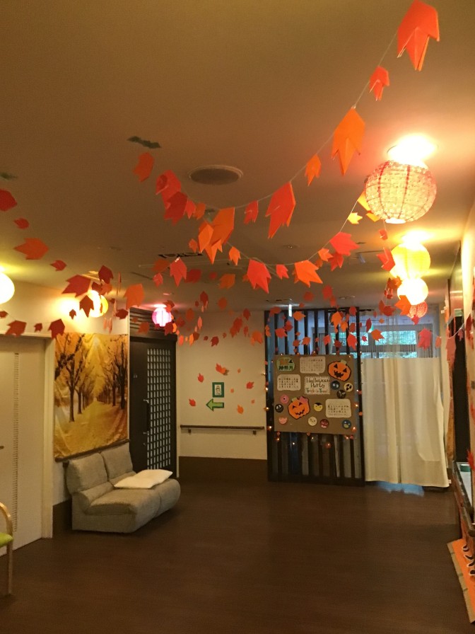 前日からショートステイの玄関、エレベーターホール前をデコレーション。