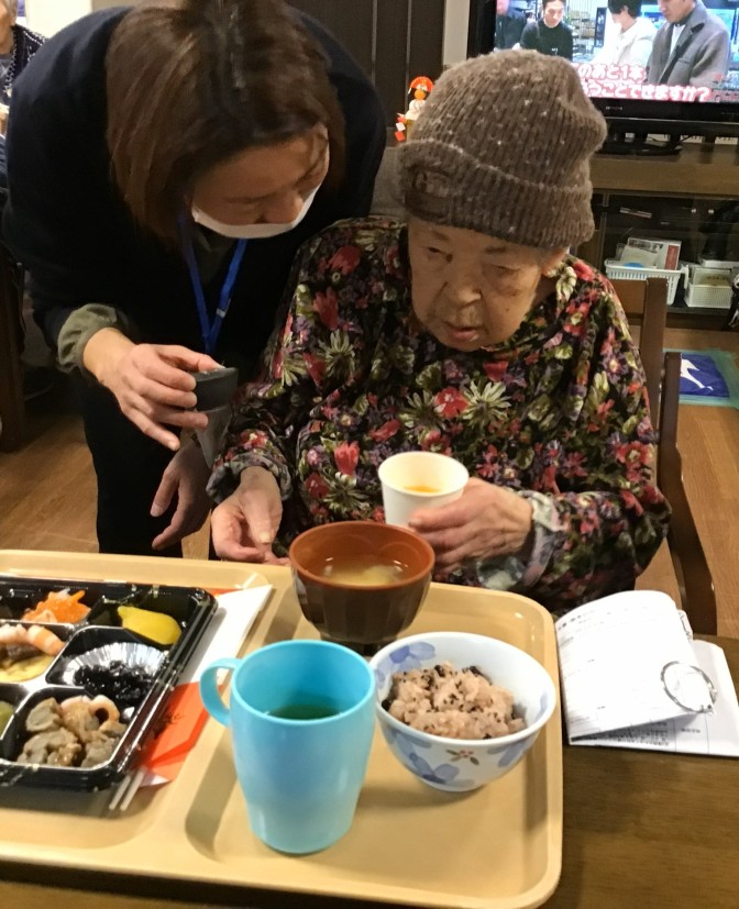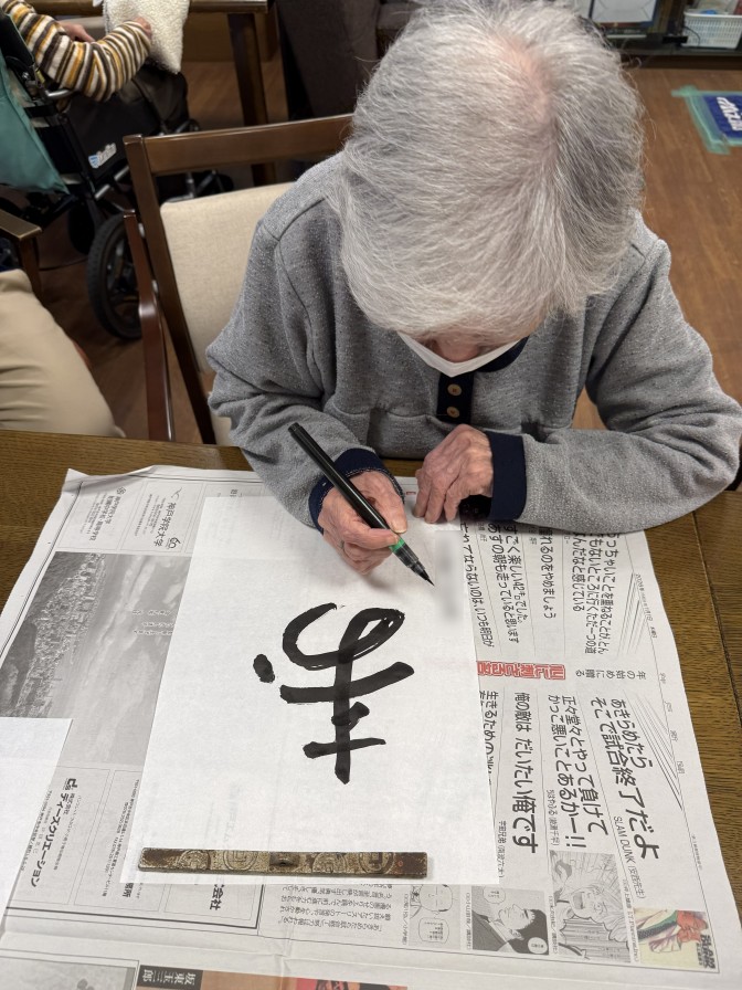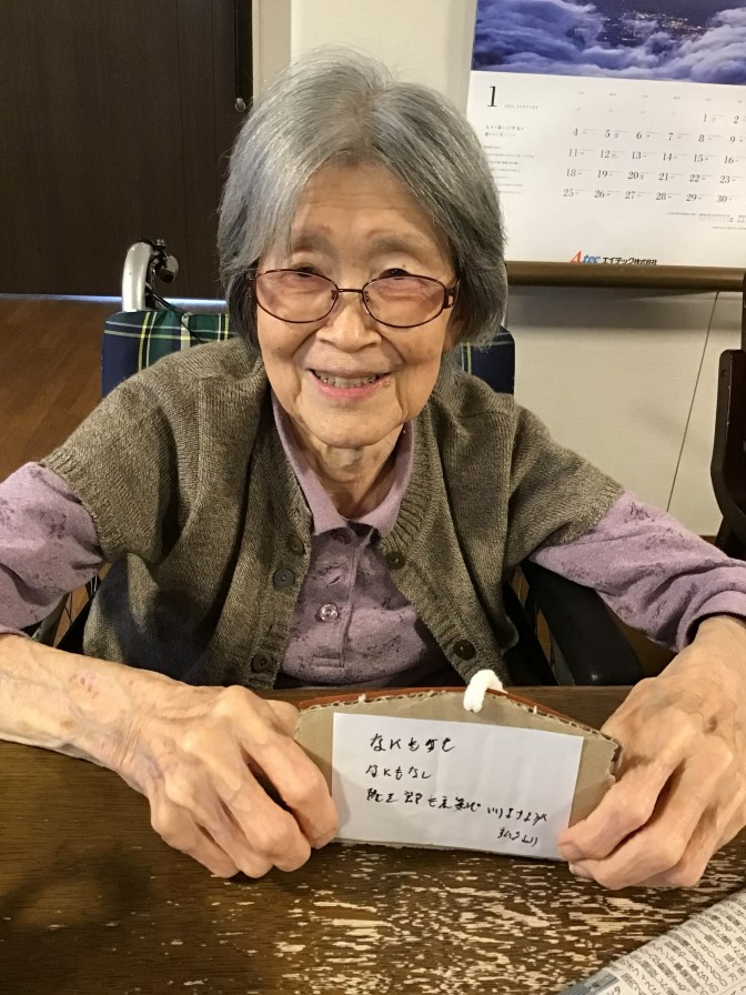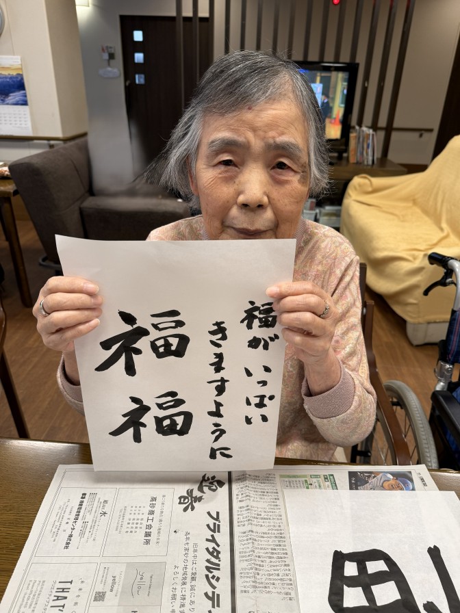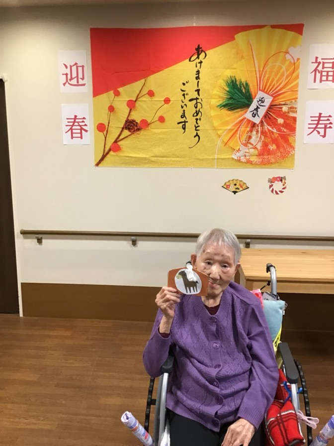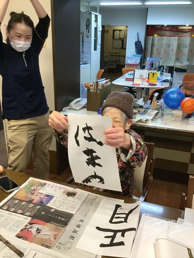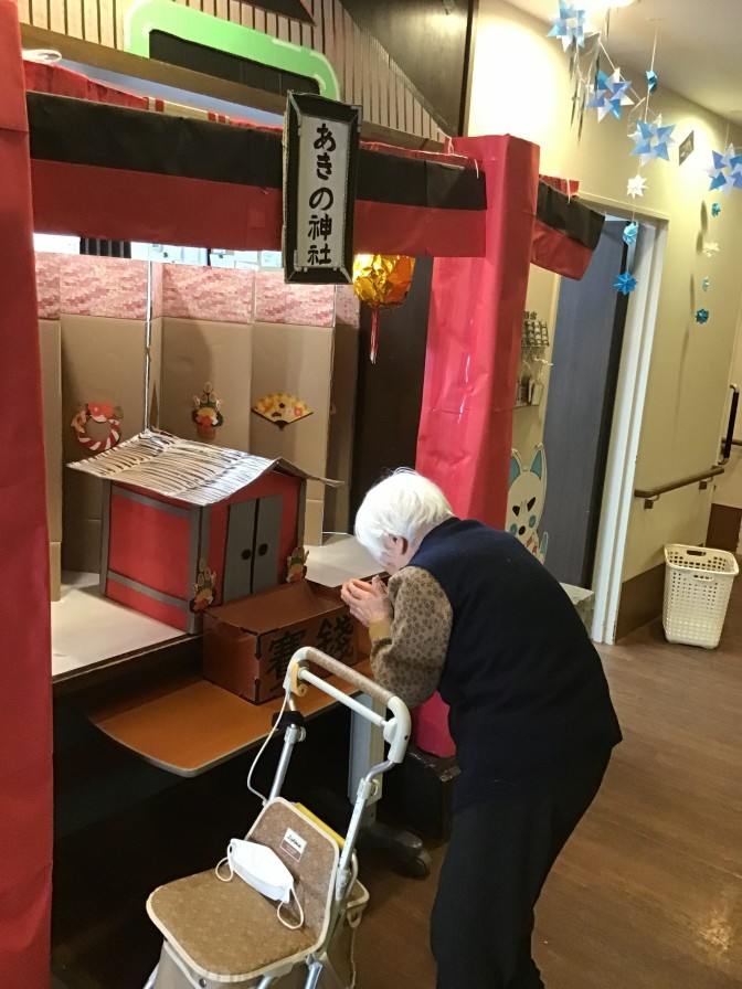 あきの荘ショートステイのお正月(*’▽’) 明けましておめでとうございます。 ショートステイでも初詣・新年会を行いました。 昨年に引き続き、今年も初詣気分を施設で味わっていただくため、「あきの神社」を設置しました。 今年は絵馬を書いていただき、素晴らしい一年になるように祈願していただきました。 2日からはご利用者さまと一緒にお正月遊びや書初めを楽しみました。 大きな歓声と、笑い声が聞かれ、素敵なお正月となりました(*^▽^*)。