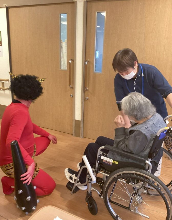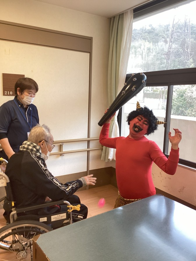 今年の節分も さつき園に赤鬼がやってきました! 見た目の迫力に、こわがってしまわれる方もいるくらいの本気の赤鬼さん みなさまに、豆に見立てたボールで豆まきをしていただき 「鬼は外~!福は内~!」と鬼退治!! みなさまの無病息災を願いました。