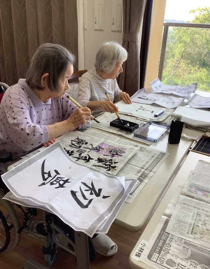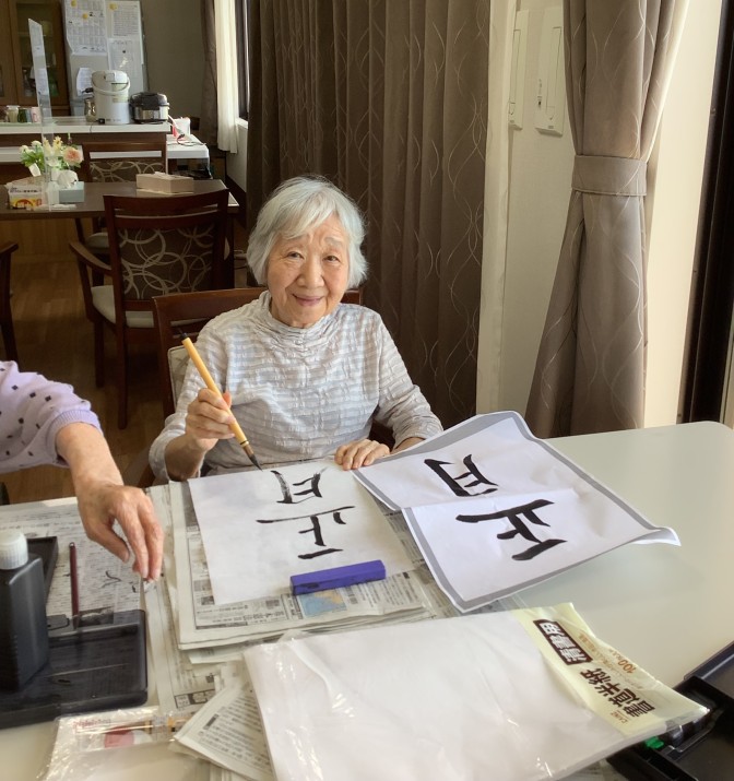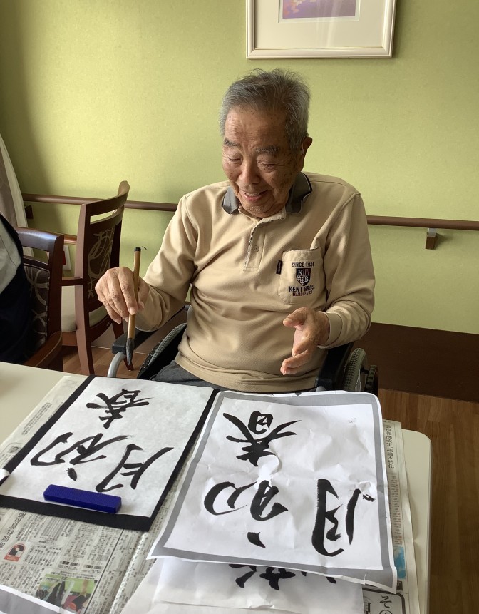本日はレクリエーションとして 書道をして頂きました(*^▽^*) 皆様真剣であり 楽しまれています( ..)φメモメモ 久しぶりで 本気出すわよ('◇')ゞ 綺麗に書いていくわよ 昔を思い出すわ( *´艸`) どうやーと言わんばかりの 笑顔ですねー(*´з`) 本日は昔懐かしの 書道でした( ..)φメモメモ