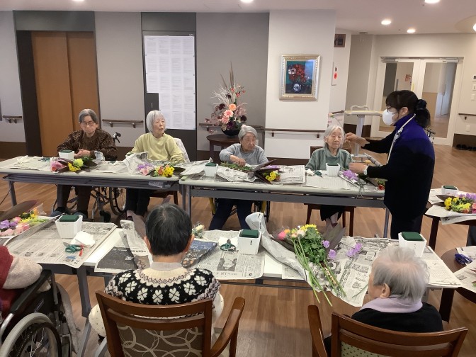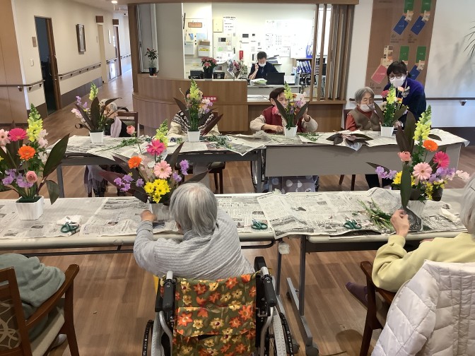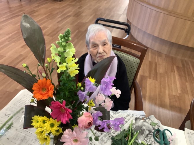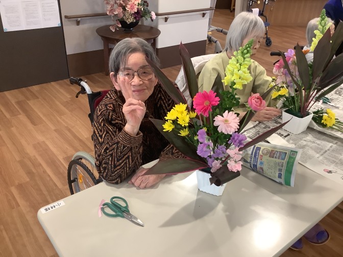 この度は毎月恒例の フラワーアレンジメントを 開催いたしました 皆様、この日を楽しみに されています。 色々な思いで お花を生かします。 あら、ご満足な様子で 職員も嬉しくなります。 本当に上手にされます。 素敵な笑顔。 この度はみんな大好き フラワーアレンジメントでした。 色々なレクリエーションを していきたいと思います。 宜しくお願いいたします。