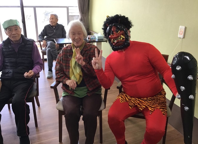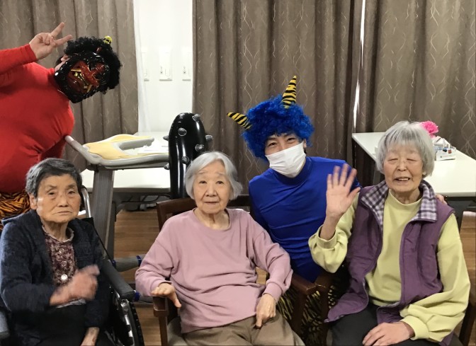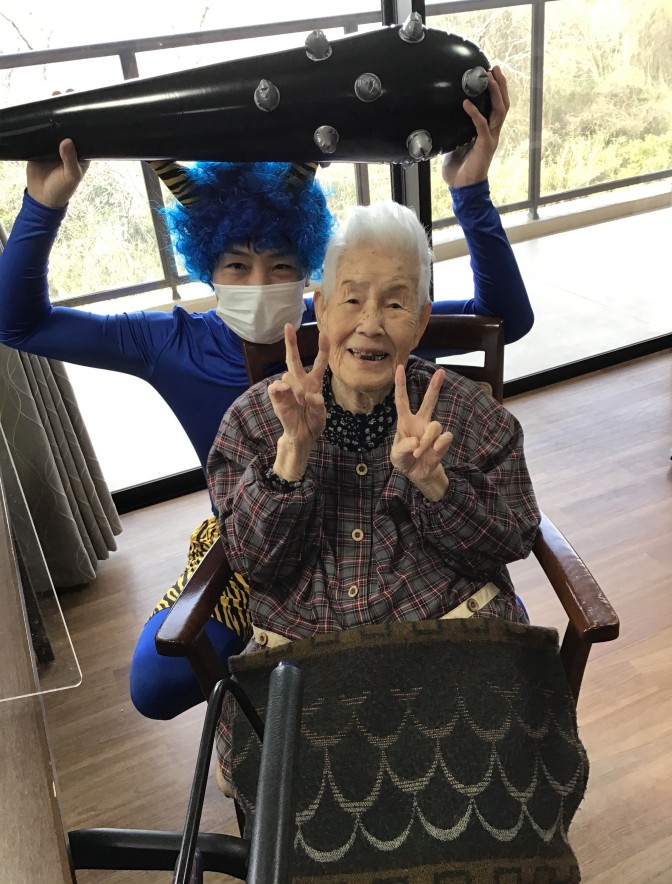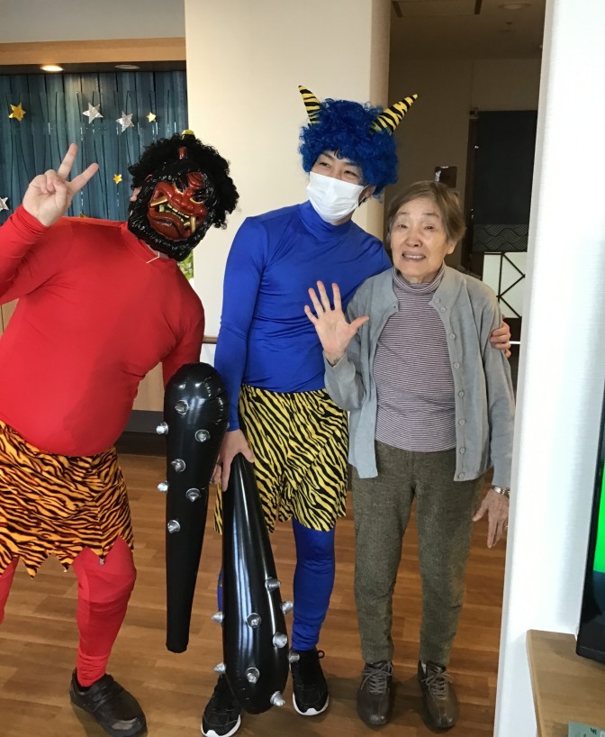 本日は節分の日のブログになります。 当施設ではご利用者と鬼が仲良くなっております。 皆様、いつもと違うイベントで鬼と一緒に楽しまれています。 皆さんで豆まきをし、「鬼は外、福は内」と元気な 声が響き渡りました。 鬼役の職員と一緒に楽しく写真撮影も行い、笑顔 あふれるひとときとなりました。 今年一年の健康と幸せを願う、心温まる行事となりました。