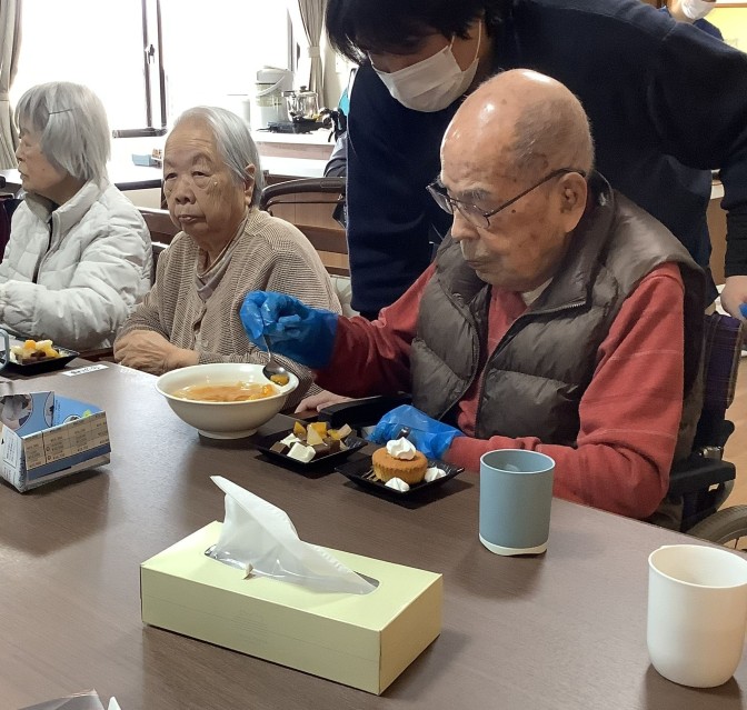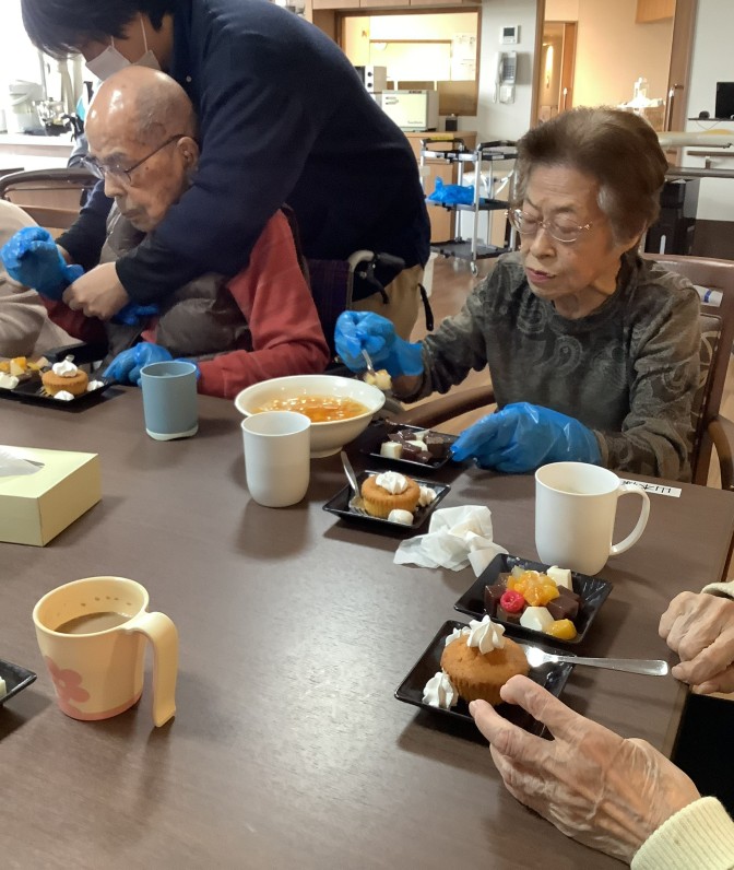 この度は各階主催の おやつレクリエーション でございます。 まずは盛り付け を真剣にされています。 色々な盛り付けが 楽しいレクリエーションです 皆様、作るのも食べるのも楽しみ にされています。 この笑顔の為に 職員も頑張れます。 写真は緊張される方も でも楽しいひと時 本日は各階恒例の おやつレクリエーション でした。 ありがとうございました。
