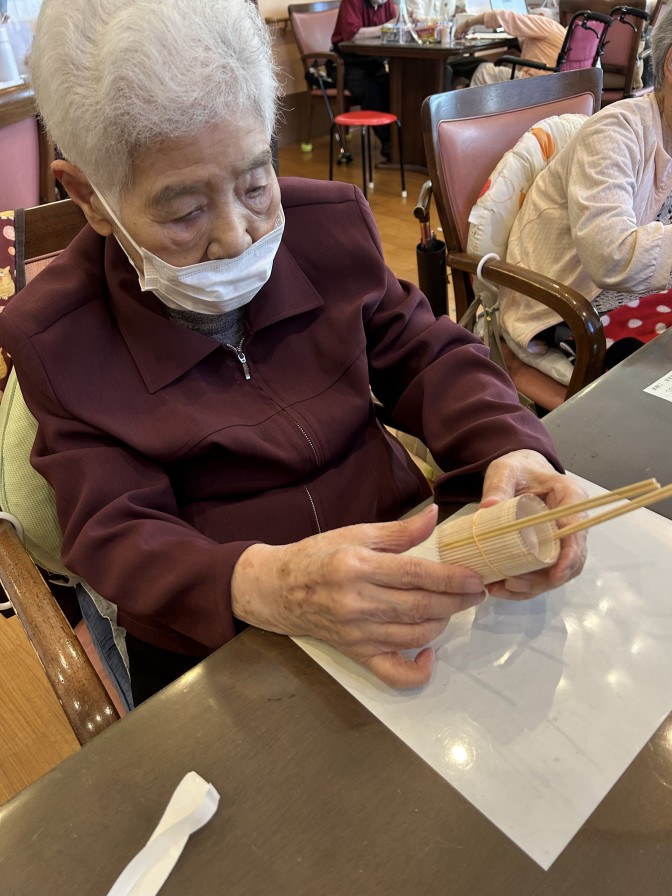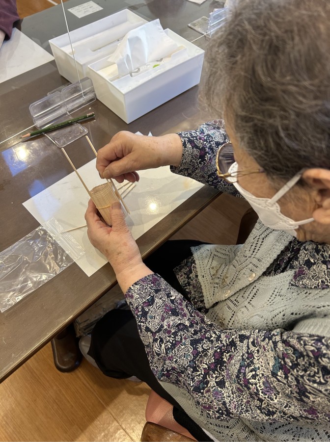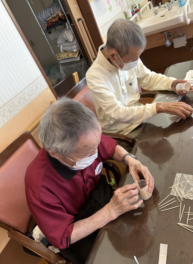乳酸菌飲料のカップに爪楊枝と竹串を貼り付けていきます。